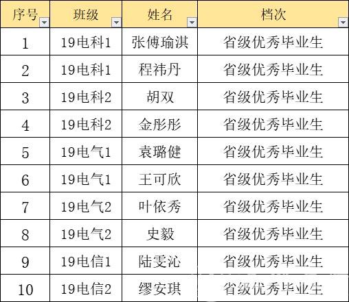 根据《yl7703永利官网优秀毕业生评选办法》(温大行政发[2020]104号),按照学校初次分配名额,根据前期进行2023届省级优秀毕业生的预评选,推荐19电科1张傅瑜淇 等10名同学获得省级优秀毕业生荣誉称号,现将名单进行公示。