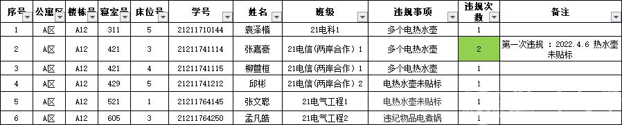 根据学校学生公寓安全“四级联查”工作机制要求,学工部、研工部、后勤管理处、保卫处、资产公司联合于2月23日对学生公寓区安全情况进行检查。在检查中永利官网存在6起安全违规现象,现予以通报批评,请大家引以为鉴。