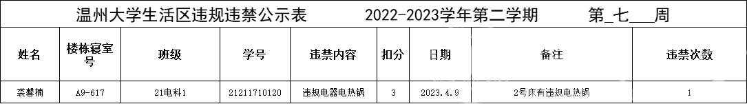 自2022-2023学年第二学期入学开始,学校针对宿舍安全每周进行大排查。根据学校第七周寝室安全卫生检查结果,排查到1位同学存在寝室违规现象,受到学校通报。现根据学校相关规定,对该名同学进行院内通报批评,请其他同学引以为戒(名单见下)。
