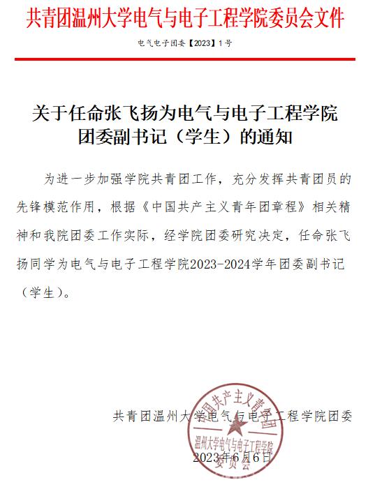 关于任命张飞扬为yl7703永利官网团委副书记(学生)的通知