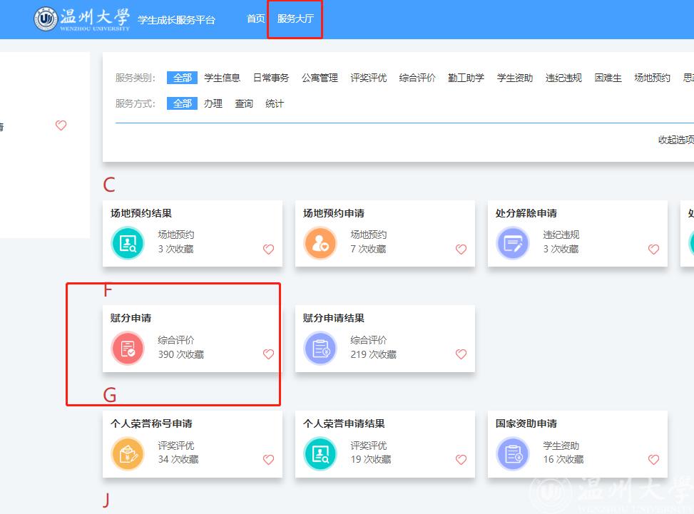 一、录入平台:统一身份认证平台—学工系统(新)—服务大厅—综合评价—赋分申请