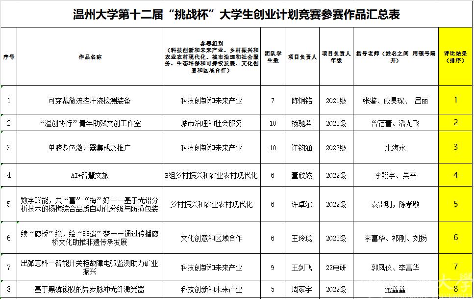 根据校发《关于举办yl7703永利官网第十二届“挑战杯”大学生创业计划竞赛和开展2024年度“挑战杯”专项学生科研课题项目申报的预通知》等相关文件要求,经团队申请、学院评比,现对永利官网本届“挑战杯”大学生创业计划竞赛评审结果(排序)予以公示。