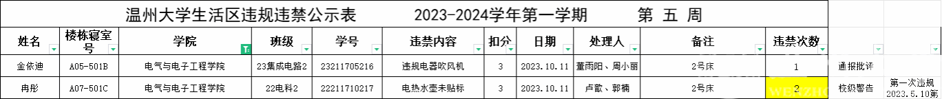 自2023-2024学年第二学期入学开始,学校针对宿舍安全每周进行大排查。根据学校第五周寝室安全卫生检查结果,排查到2位同学存在寝室违规现象,受到学校通报;同时排查第五周寝室安全检查有2位同学存在寝室违规。现根据学校相关规定,对上述同学进行院内通报批评,请其他同学引以为戒(名单见下)。