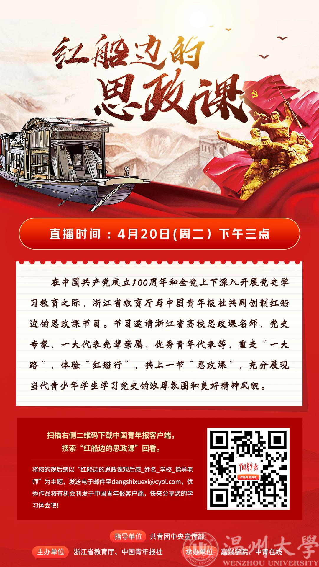 直播时间:2021年4月20日(周二)15:00至16:00,直播地址:中国青年报App客户端(进入客户端搜索“红船边的思政课”,客户端、PC端直播链接http://news.cyol.com/gb/live/articles/2021-04/15/content_KEVGmHBbA.html);“教育之江”微信公众号、浙江高校网络思想政治工作中心、“之江汇”教育广场等平台将提供相关观看渠道。