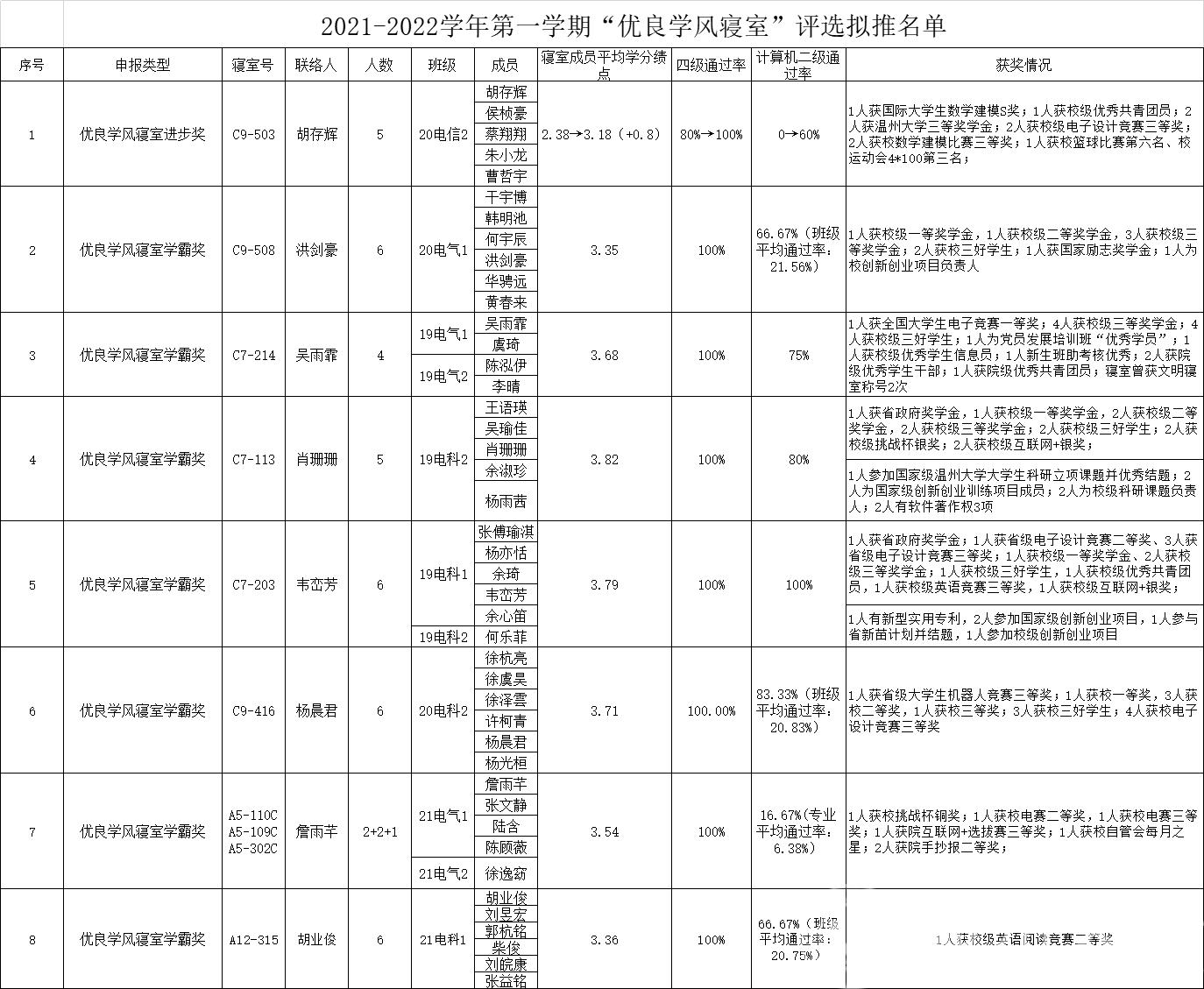 为进一步加强院风学风建设,发挥优秀寝室树立的导向和典型作用,引导和激励广大学生刻苦学习、立志成才,根据《yl7703永利官网优良学风寝室评选办法》规定,经各寝室申请,学院初评,拟推荐 C9-503等8个寝室获得2021-2022学年第一学期“优良学风寝室”称号。现将拟立项名单给予公示