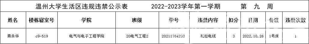自2022-2023学年第一学期入学开始,学校针对宿舍安全每周进行大排查,根据学校第七周寝室安全卫生检查结果,排查到1位同学存在寝室违规现象,受到学校通报。现根据学校相关规定,对上述同学进行院内通报批评,请其他同学引以为戒(名单见下)