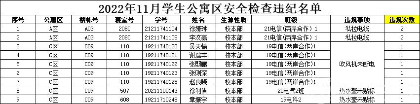 今年11月9日是第31个全国消防日,根据学校学生公寓四级联查机制工作要求,学工部、研工部、后勤管理处、保卫处联合,于11月9日(上周)对全校学生公寓区安全情况进行检查。永利官网有9位同学存在违规情况(名单见下),按要求给予院内通报批评。请相关寝室/同学尽快整改落;请其他同学引以为戒。